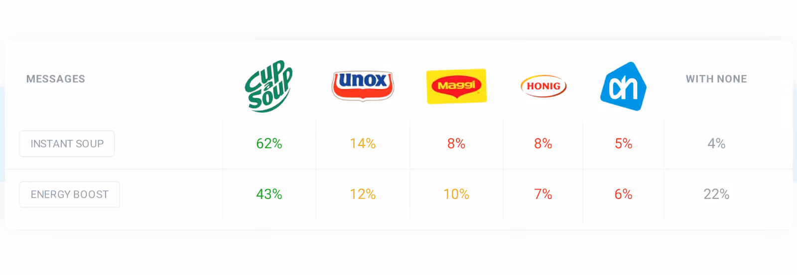 What makes this extra painful: Cup-a-Soup already owns this territory. Before people saw the ad, Cup-a-Soup was by far the strongest brand linked to instant soup (62%) and also led on energy boost (43%) versus Unox, Maggi and others.