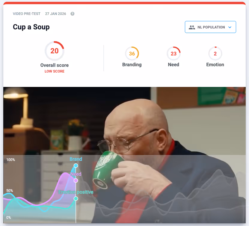 The spot scored an overall result of 20 (low), meaning it performs better than only 20% of Dutch ads. That’s driven by: