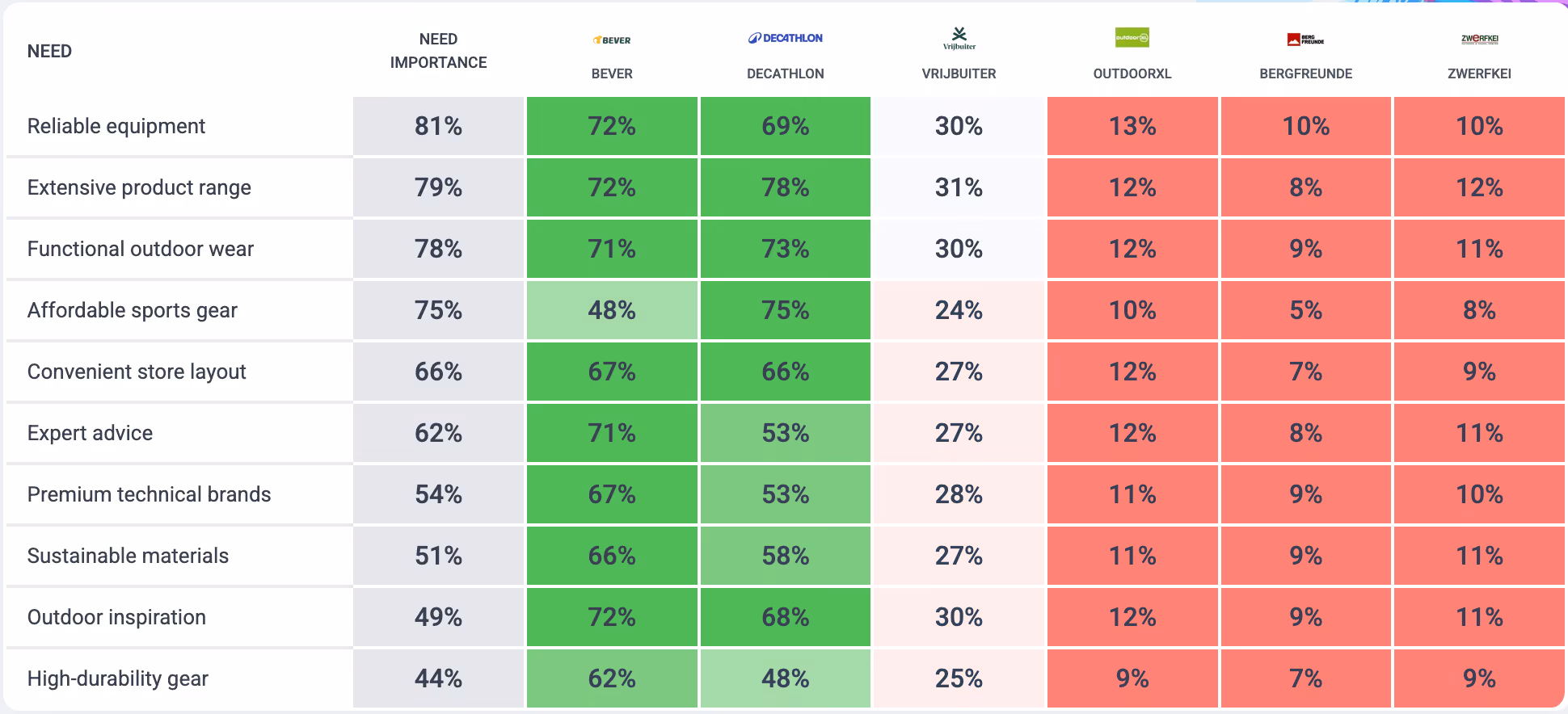 Using Behavioâs market mapping data, we analyzed how Dutch category buyers associate key outdoor needs with major retailers: Bever, Decathlon, Vrijbuiter, OutdoorXL, Bergfreunde, and Zwerfkei.