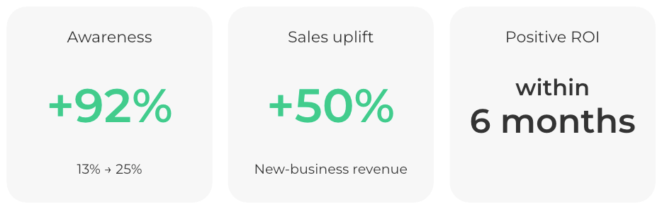 Awareness nearly doubled (from 13% to 25%), new-business revenue grew by 50%, and they recouped their investment within 6 months.