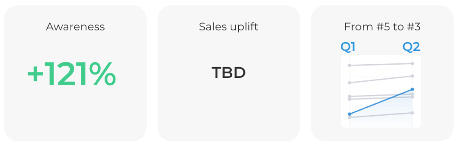Within three months, awareness had more than doubled (+121%), and the brand jumped from number five to number three in the category.