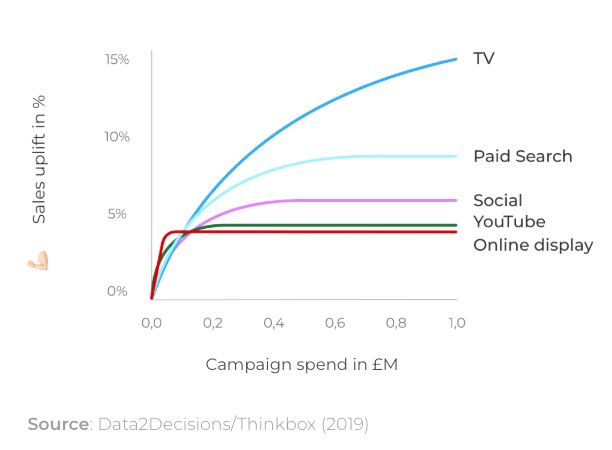 When brands shift even part of their budget from activation to brand-building, growth resumes. As TV spend increases, sales uplift keeps rising – while social media, YouTube, and display quickly plateau.
