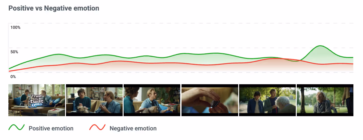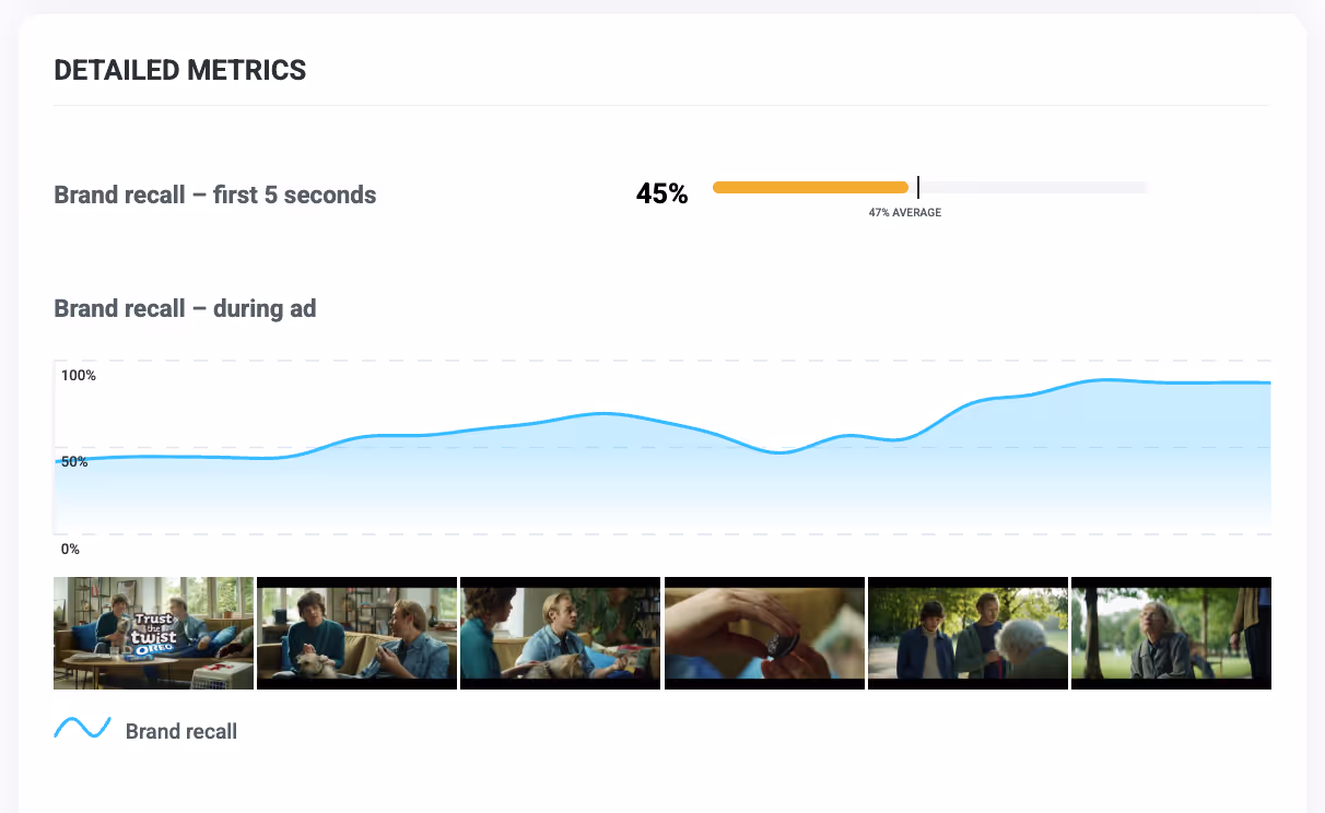 The ad’s strongest performance was in branding, with 61% of viewers able to recognize Oreo as the brand behind the spot, well above average. Clear brand assets like the packshot, signature Oreo colors, and the claim “Trust the Twist” played a key role here.